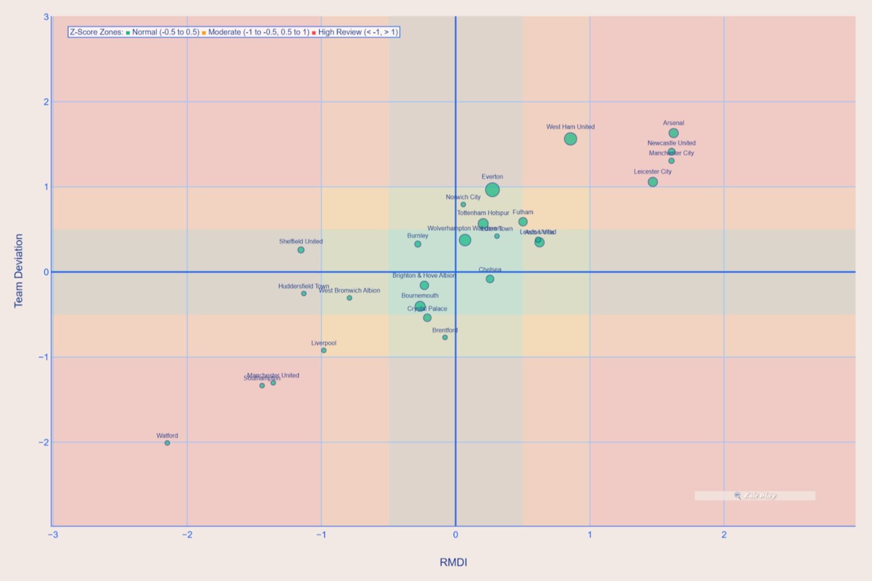 Analysis reports including RMDI and Team Deviation Analysis that compares two team-referee combinations to referee and team overall averages. These scores, used in tandem, help to determine whether or not a referee is more lenient or harsh when refereeing two teams.